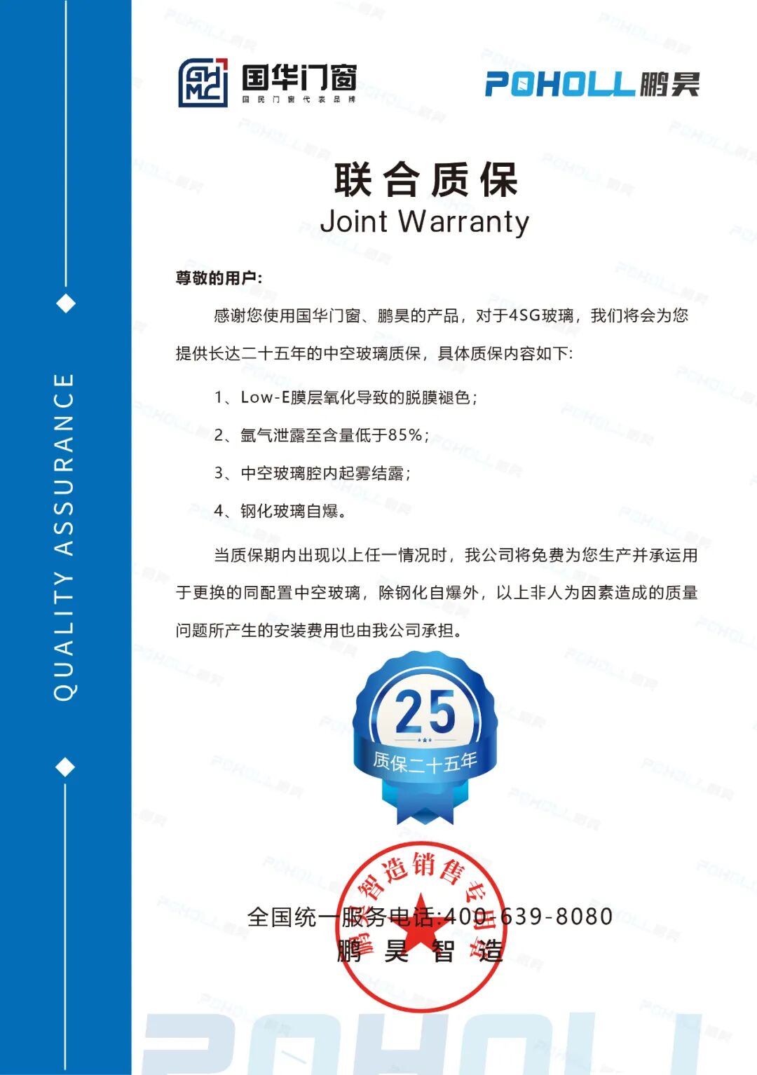 Etiam notabilius, Guohua Portae & Windows et Penghao coniunctim warantum extensum iecerunt, 4SG vitrum cum 25 annorum warantia in speculo insulante praebentes. Hoc munus plures clavibus exitibus, incluso delaminatione et discoloratione, ex oxidatione cinematographici Belgii, lacus gasi argonis usque ad 85% infra, obumbrans et condensationem in cavo vitreo insulante, et vitrum spontaneum explosionem temperavit. Talis comprehensiva et diuturna warantia rara est in industria et plene demonstrat utriusque fiduciae in productum qualitatem et altam obligationem cum clientibus.